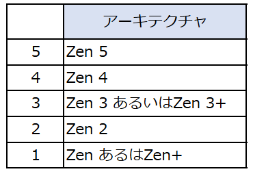 ▼4桁数の3桁目の④は、一部に例外もありますが、概ねアーキテクチャを示しています。Ryzen 7 7735HSの場合、3桁目は「3」であることから、モデル名のみで Zen 3 あるいは Zen 3+であることがわかります。