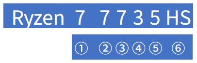 AMD Ryzen モバイル向けCPUにおける型番の見方について、その概要を記載します。上の画像の事例は今回のRyzen 7 7735HSですが、①~⑥は概ね以下を示しています。