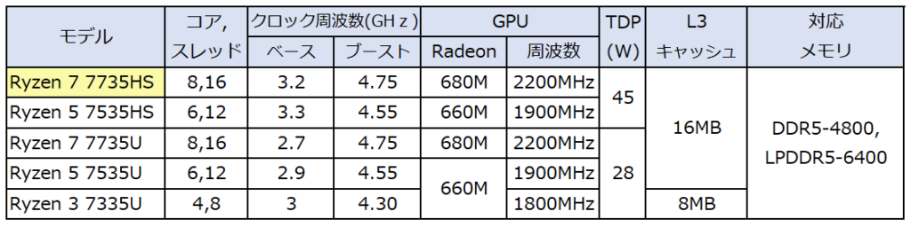 ▼同世代の主だったCPUのモデルを掲載しました。Ryzen 7 7735HSは上位のCPUです。