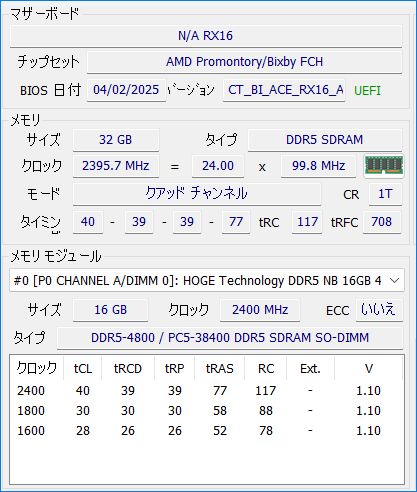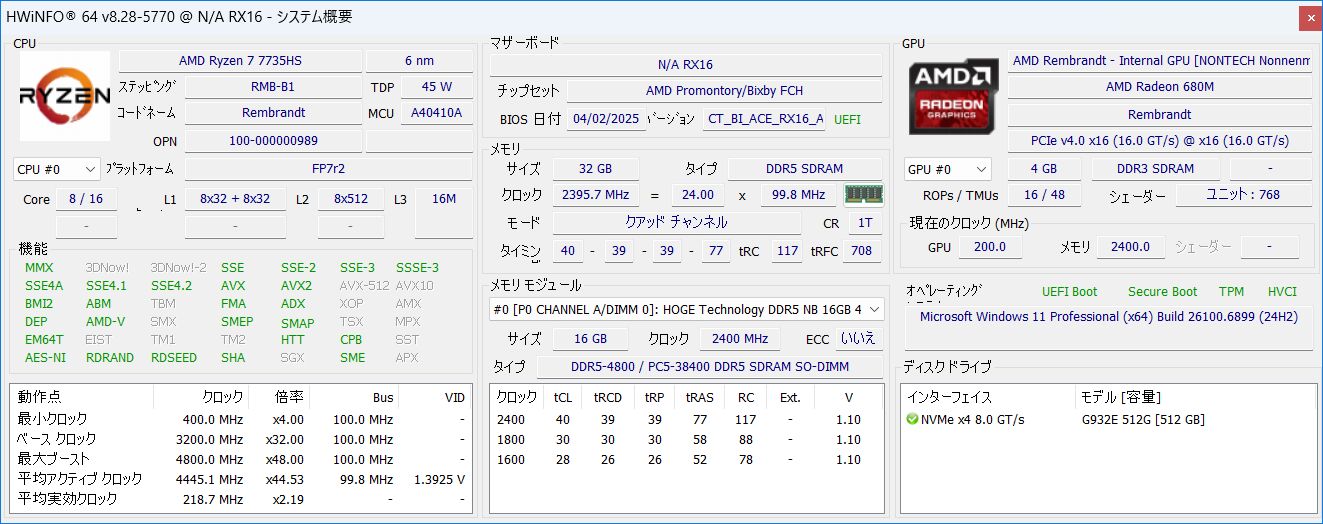 続いて、「ACEMAGIC RX16」の実機から抽出のシステム情報を掲載します。システム情報は、以下の記事にて紹介のフリーソフト「HWiNFO」から抽出しています。