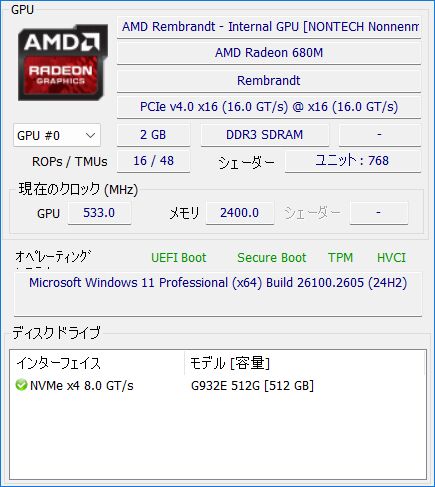 ▼上の画像のうち、CPUの情報です。もちろん、仕様どおりに Rembrandt / Zen 3+ アーキテクチャ、6nm プロセス、TDP 45W、8コア 16スレッド、L3 キャッシュは16MBです。