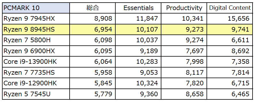 Ryzen 9 8945HS、実機で計測のベンチマークスコア