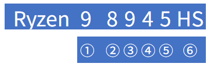 AMD Ryzen モバイル向けCPUにおける型番の見方について、その概要を記載します。上の画像の事例は今回のRyzen 9 8945HSですが、①~⑥は概ね以下を示しています。