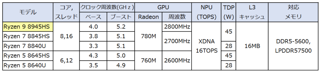 ▼同世代の主だったCPUのモデルを掲載しました。Ryzen 9 8945HSは上位のCPUです。以下に掲載のCPUはいづれもNPUに対応していますが、最大 16TOPSです。