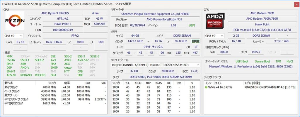 続いて、Ryzen 9 8945HSを搭載するPC実機から抽出のシステム情報を掲載します。システム情報は、以下の記事にて紹介のフリーソフト「HWiNFO」から抽出しています。