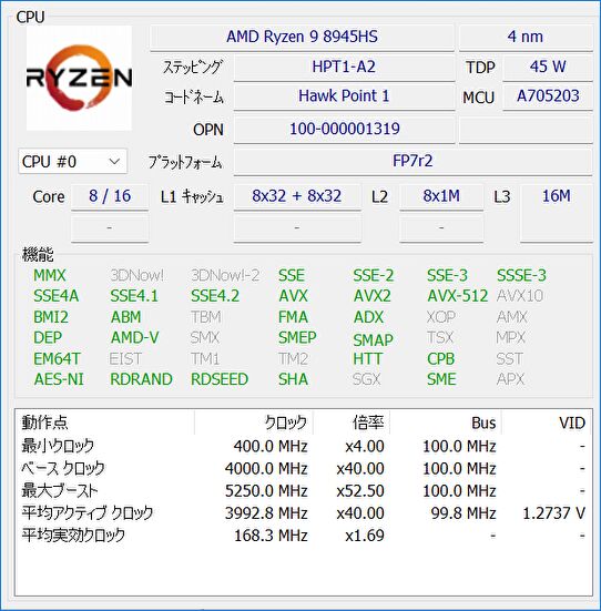 ▼上の画像から CPUの情報を拡大。AMD Ryzen 9 8945HSは、Zen 4 アーキテクチャ、4nm プロセス、8コア16スレッド、TDP 45W、L3 キャッシュ 16MBです。