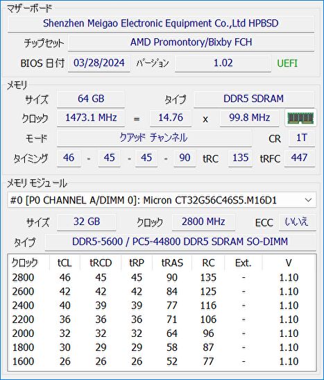 ▼メモリはPCにより異なるために参考情報ですが、「MINISFORUM UM890 Pro」に搭載のメモリの事例です。DDR5 32GB x 2の64GBの構成です。