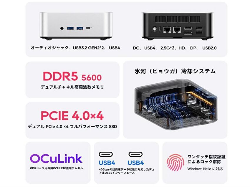| ポート類 | USB4 x 2、USB-A 3.2 Gen 2 x 2、USB-A 3.0、USB-A 2.0、HDMI、DisplayPort、2.5G イーサネット x 2、OCulink |