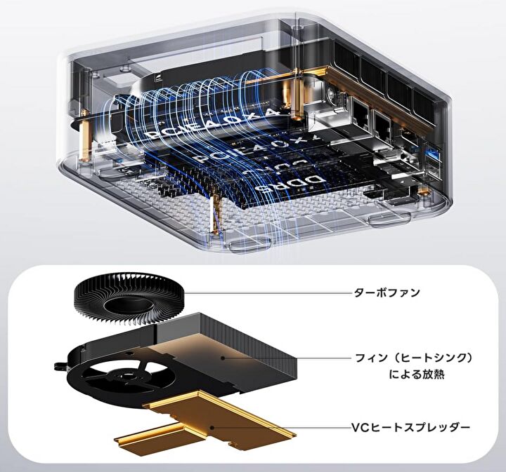 ▼GMKtecやMINISFORUMなど、このクラスのミニPCの場合には システムファンを装備していることが多いのですが、本製品はCPUファンのみの装備です。