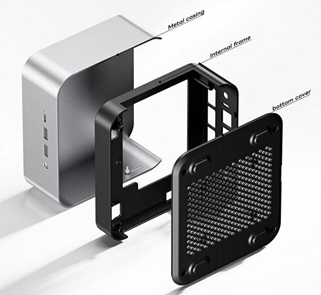 ▲▼高品質なアルミ製の筐体に樹脂のフレームを備えています。一見して以下の記事にて実機レビューの「MINISFORUM AI X1」と同筐体と思ったものの、異なるようです。