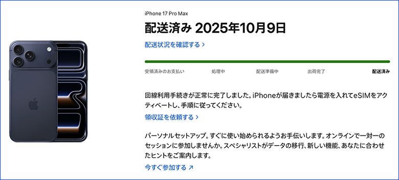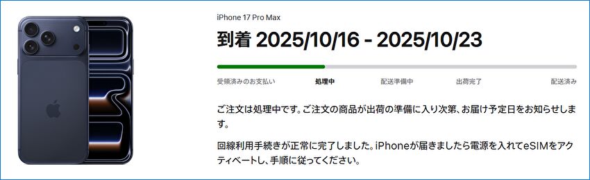 なお、私のiPhone 17 Pro Maxの納期については、2025年9月21日に注文し 受取は10月8日。発売間もない時期の注文でもあり、約2週間の納期でした。