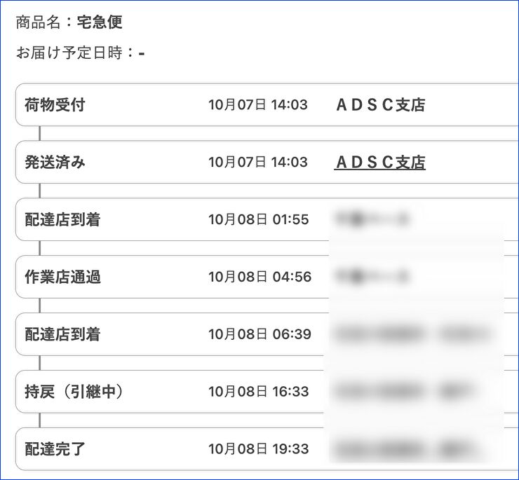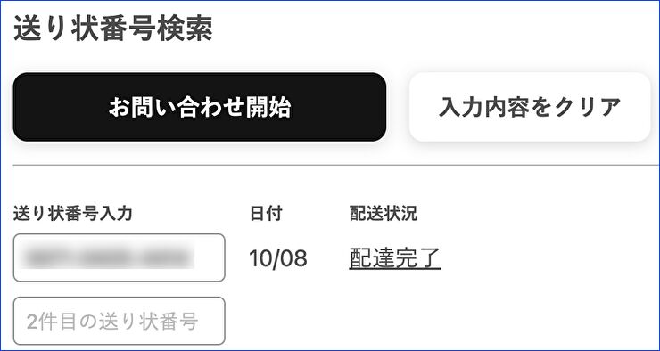 ▲▼iPhone 17 Pro Maxを受領後に確認してみると、10月9日に配送済みとなっています。上の「配送状況を確認する」を押下すると、ヤマト運輸のページに遷移し、以下の詳細を確認することができました。
