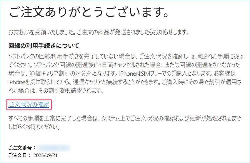 注文・支払手続きの完了後に受領する、上の画像の「ご注文ありがとうございます」のメールに記載の「注文状況の確認」のリンクから、Apple Storeにアクセスします。