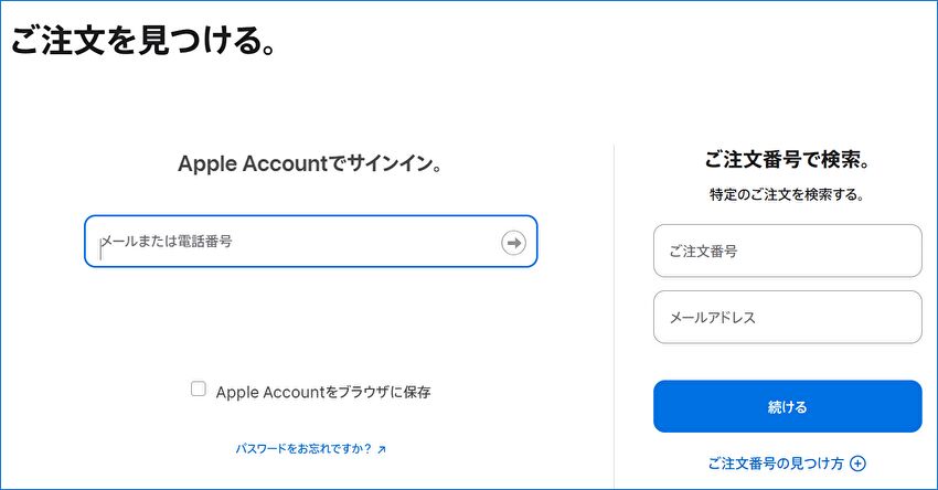 ▼以下の画面となりますので、Apple Accountでサインインします。あるいは、注文番号を確認済の場合には、右の「ご注文番号」を入力します。ここでは、前者のサインインから始めることを前提とします。