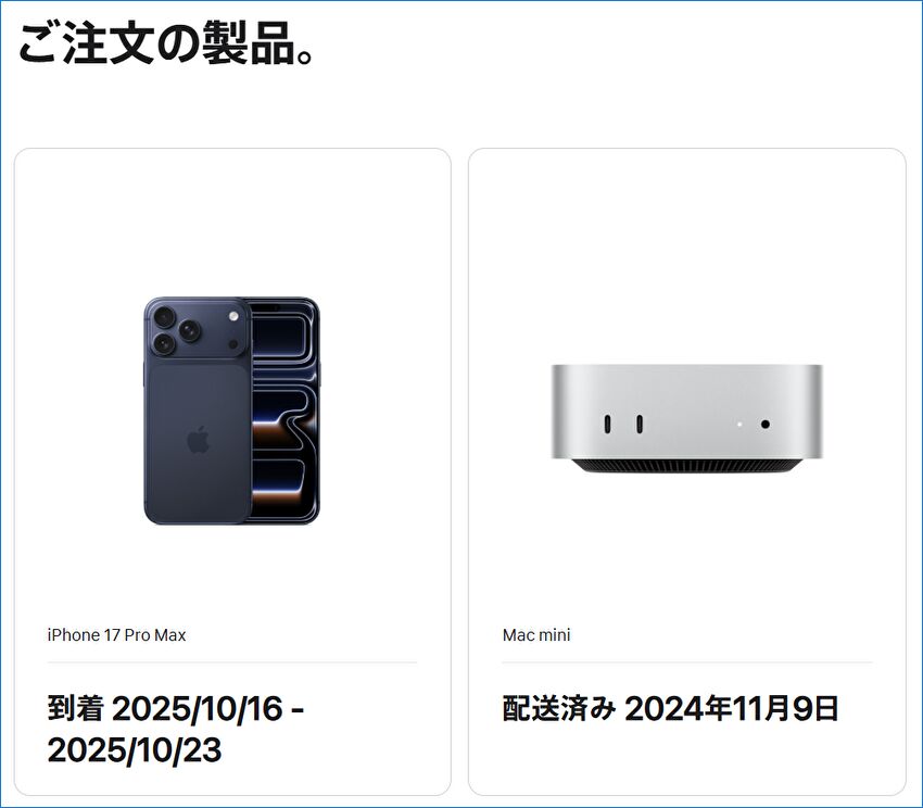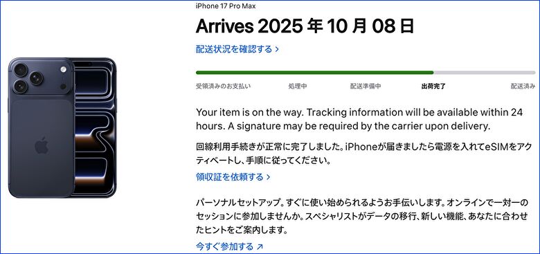 これまで Apple Storeで購入したMacの場合、製品が即発送となったのですが、今回購入のiPhone 17 Pro Maxにおいては、2025年9月21日の注文から受領まで 約2週間要しました。