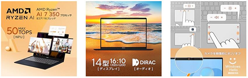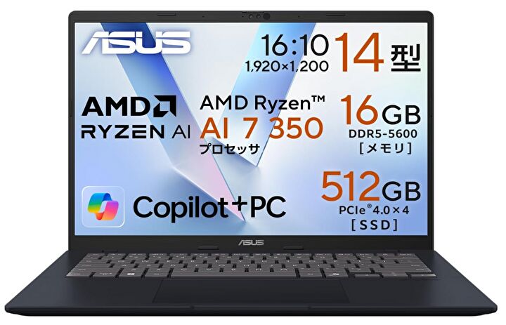 2026年1月1日現在、Amazon および ASUS 公式ストアにて、AMD Ryzen AI 7 350を搭載する14インチノートPC「ASUS Vivobook 14、M1407KA」が 129,800円で販売されています。