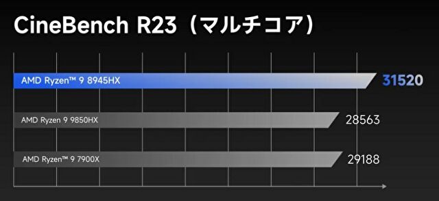 ▲▼CPUはモバイル向け、AMD Zen 4 アーキテクチャのRyzen 9 8945HX(16コア 32スレッド)。CINEBENCH R23 マルチコアのスコアは 31,520と公開されています。以下の記事にて、これまで実機で計測した同ベンチマークのスコアを一覧化していますが、Ryzen 9 7945HXのスコアが32,963ですので、31,520はやや控えめな掲載とも思います。