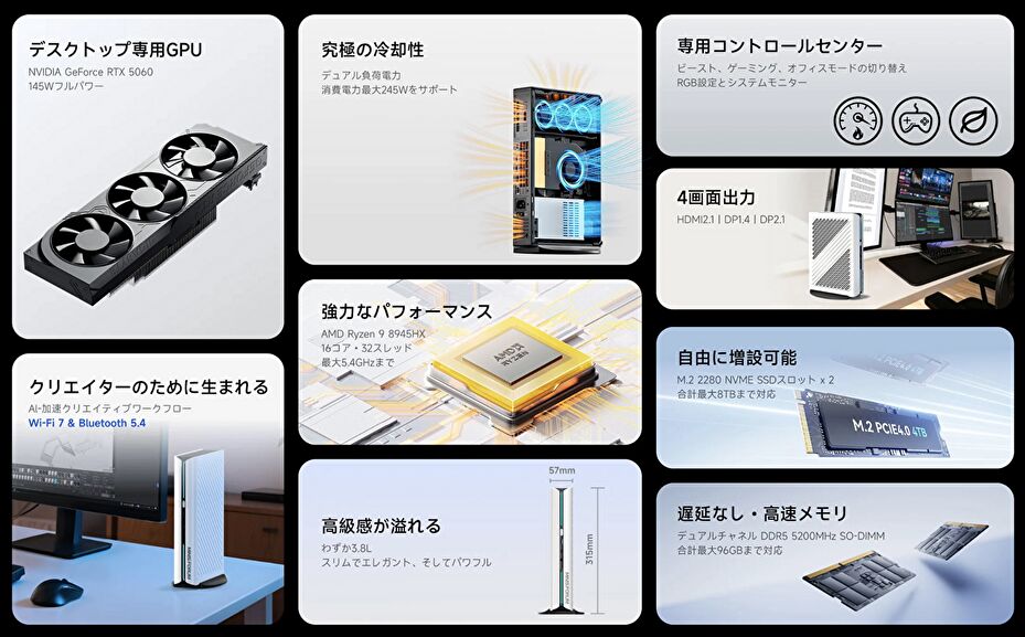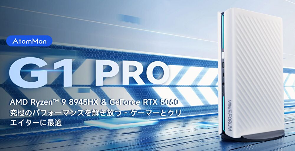 MINISFORUMより、CPUに16コア 32スレッドのAMD Ryzen 9 8945HX、GPUにデスクトップ向けのNVIDIA GeForce RTX 5060(8GB、TDP 145W)を搭載するWindows 11 PC「AtomMan G1 PRO」が、公式ストアにて掲載されています。2025年12月1日現在、公式ストアでは予約販売扱い、出荷予定日は2026年1月10日となっています。