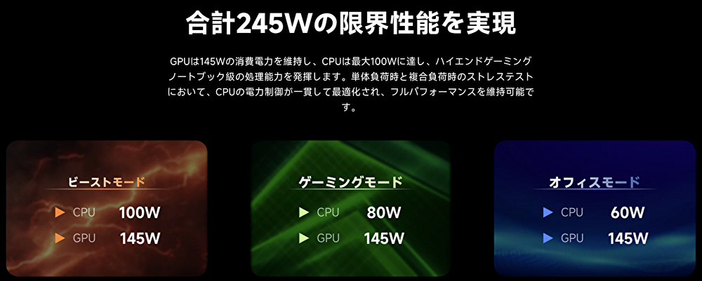 ▼「ビーストモード」「ゲーミングモード」「オフィスモード」と電源モードを切り替えることができます。グラボは145Wに固定し、CPUの消費電力を可変としています。