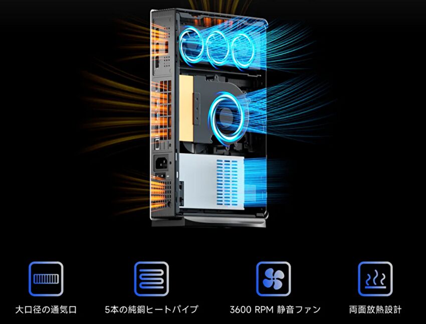 ▼私は同社の複数のミニPCを実機レビューしているなか、いづれの製品も冷却対応はよく考慮されています。本製品の場合、グラボの3連、電源ファン、CPUファンと一般的な構成。細身の筐体で空間に余裕がないように思われますが、実機で確認したいところです。