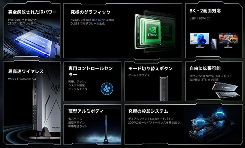 ミニPCでお馴染みのMINISFORUMより、CPUに Core i9-14900HX、GPUにNVIDIA GeForce RTX 5070 Laptopを搭載する ゲーミングPC「AtomMan G7 Pro」が発売となりました。