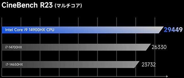 ▲▼公式サイトに、CINEBENCH R23のマルチコアのスコアは 29,449と公開されています。同じく Core i9-14900HXを搭載する従来モデルの「AtomMan G7 Ti」では「シングルコア 2,205、マルチコア 31,700」としていしましたが、仮に「マルチコア 29,449」とした場合にも、以下の記事で掲載の私がこれまでに実機レビューしたCPUのなかではトップクラスです。