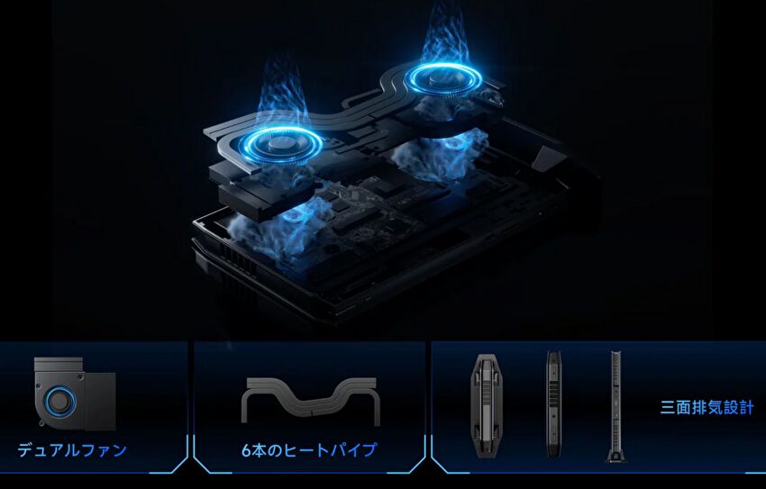 ▲▼ハイスペックとなると冷却対応が気になるところですが、サイドの広い面積の通風孔、2つのファン、放熱用の6本のヒートパイプでの対応です。MINISFORUMのミニPCは、冷却対応にしっかり対応し、かつ静音の製品が多く、本製品も課題はないものと思われます。