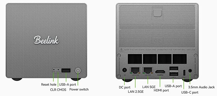 | ポート類 | USB-C(10Gbps、映像出力対応)、USB-A 3.2、USB-A 2.0 x 2、HDMI、RJ45 5G Realtek RTL8126、RJ45 2.5G Intel i226-v |