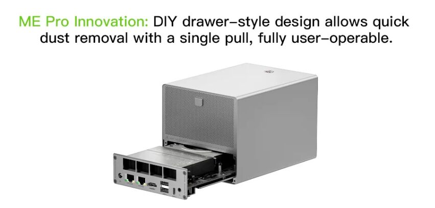 Beelinkでは先行して以下の記事にて掲載のN150を搭載するNAS「Beelink ME mini」が販売されています。「Beelink ME mini」は 電源を内蔵し M.2 SSD 6スロットの装備ですが、「Beelink ME Pro」は 3.5インチ / 2.5インチ HDDも搭載可能、5G RJ45を装備など、機能が強化されています。