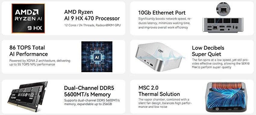 ミニPCの老舗ブランド「Beelink」より、CPUにAMD Ryzen AI 9 HX 470を搭載するミニPC「Beelink SER10 MAX」がリリースされています。セットモデルは DDR5 メモリ 32GBに M.2 PCIe 4.0 SSD 1TB、10Gb イーサネットポートを装備していることも特徴の一つです。