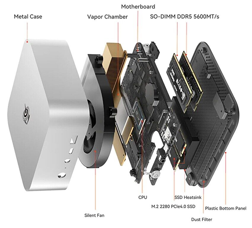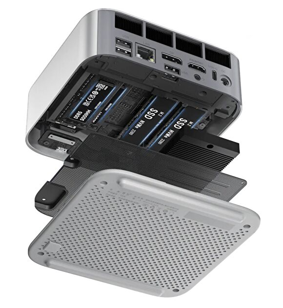 ▲▼このクラスのハイエンドのミニPCにおいて、「GMKtec」や「MINISFORUM」の製品はCPUファンとシステムファンの2つのファンを装備する端末が多いなか、「GEEKOM」と「Beelink」はCPUファンのみとし、ヒートシンクなどの冷却機能を強化する端末が多いです。なお、以下の画像のとおり、本製品は SSD冷却用のヒートシンクを備えており、冷却対応ではありませんが、底板側にダストフィルターを備えています。