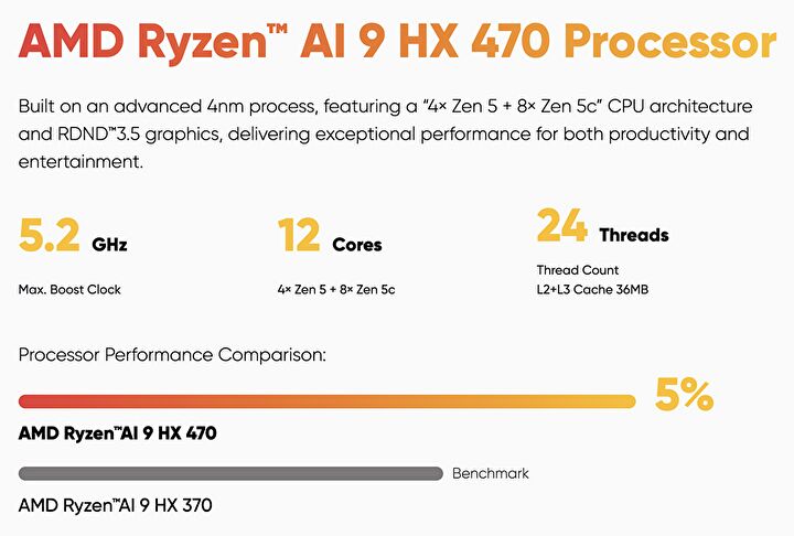 | CPU | Ryzen AI 9 HX 470、Zen 5 アーキテクチャ、12コア 24スレッド、最大 5.2GHz |