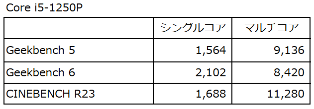 | CPU | 第12世代 Core i5-1250P、12コア 16スレッド |