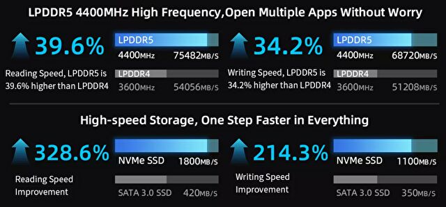 ▲上の画像下側に NVMe SSDの読み書きは「Read 1800MB/s、Write 1100MB/s」とあります。公式サイトの仕様に、PCIe 4.0 or 3.0の明記はありませんが、この速度を参照するとPCIe 3.0と思われます。なお、M.2 SSDの増設が可能ですが、SATA / PCIeの双方に対応しています。