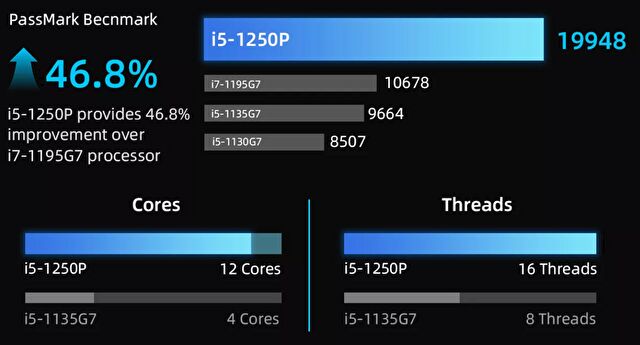 ▲▼販売ページではPassMark ベンチマークのスコアが Core i5-1135G7と比較されていますが、Geekbench 5/6、CINEBENCH R23のスコアの指標は下表です。
