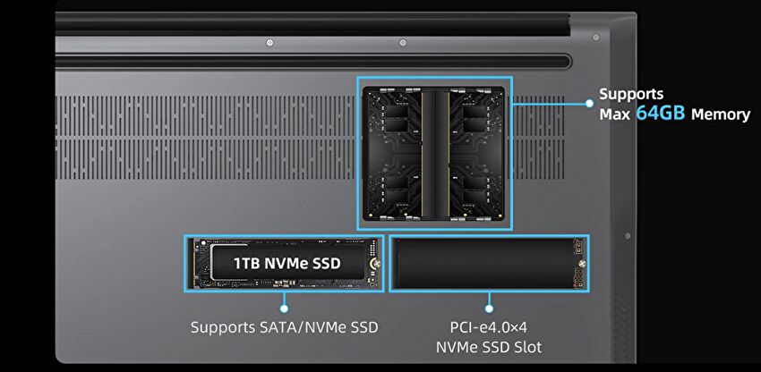 スペックは下表となりますが、上の画像のとおり、メモリ・M2 PCIe SSDともに2スロットとなり、ご自身で増設・換装できることも大きな特徴です。なお、上の画像では内部を見せているものであり、底板を開けての増設・換装となります。