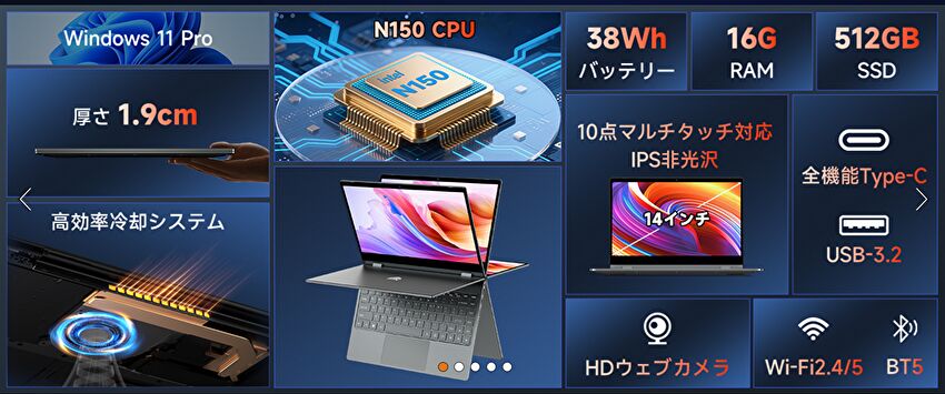 BMAXより、CPUにTwin Lake N150を搭載し、14インチ液晶が360度回転するYoga スタイルのノートPC「BMAX Y14 Plus」が販売されています。Yoga スタイルでもあり 液晶はタッチパネル、16GBのメモリ、512GBのSSDを搭載し、2025年10月19日現在のAmazon 価格は 45,900円。