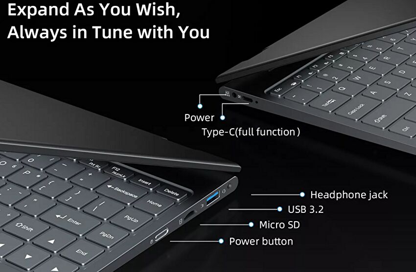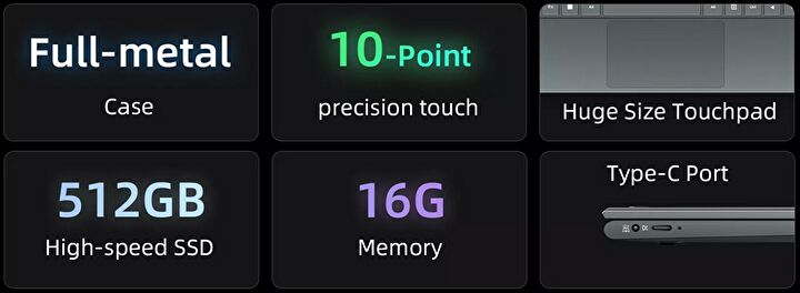 ▼Amazonの製品紹介には明記されていませんが、公式サイトの以下の画像では「Full-metal」と掲載されており、金属製の筐体です。他の一般的な中国ブランドのノートPCと同様に、天板と底板は金属製・キーボード面は樹脂と思われます。