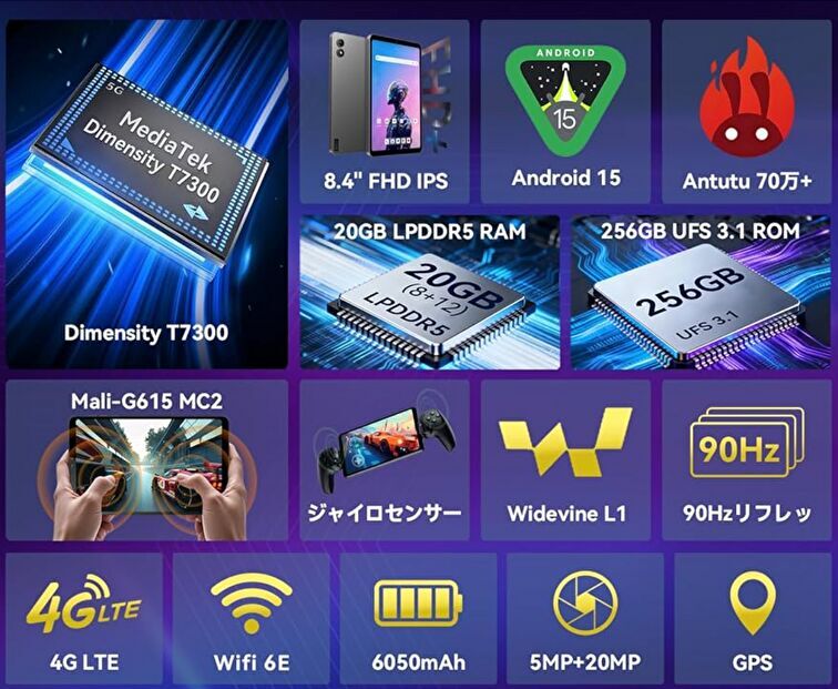 通販サイトの紹介画像においては、Dimensity 7050との比較が多用されていますが、以下の記事にて掲載の「Headwolf FPad 7 Pro」を意識しているように思います。このため、下表のスペックでは、「Headwolf FPad 7 Pro」より優位な事項に黄色網掛け、劣位な事項にピンク網掛けしています。「Headwolf FPad 7 Pro」は、Dimensity 7050を搭載するほか、2.5K 解像度の液晶が大きな特徴です。