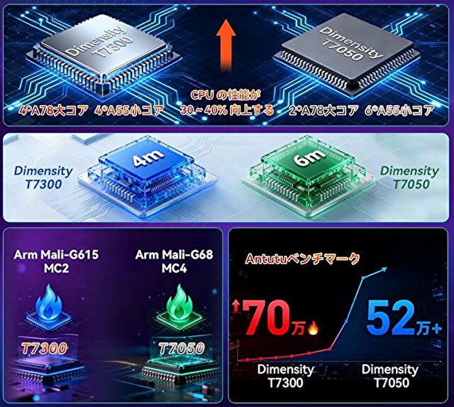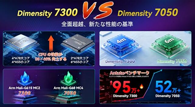 ▼前述のとおり、Dimensity 7300とDimensity 7050の比較画像が多いです。AnTuTu ベンチマーク(v10)スコアは 70万(実際には約67万) vs 52万とありますが、所有する同水準の端末の使用感では、普段使いにて レスポンス差を感じにくく、Dimensity 7050 クラスにおいても キビキビと動作します。