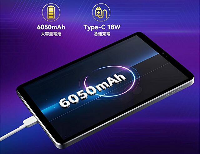 ▼バッテリー容量は、8インチクラスとしては一般的な6050mAhです。また、スマホや、よりハイエンドのタブレットと比較すると控えめですが、18Wの急速充電に対応しています。