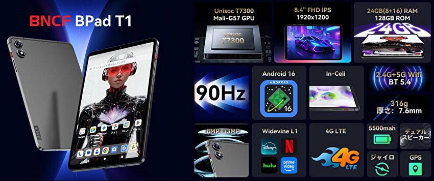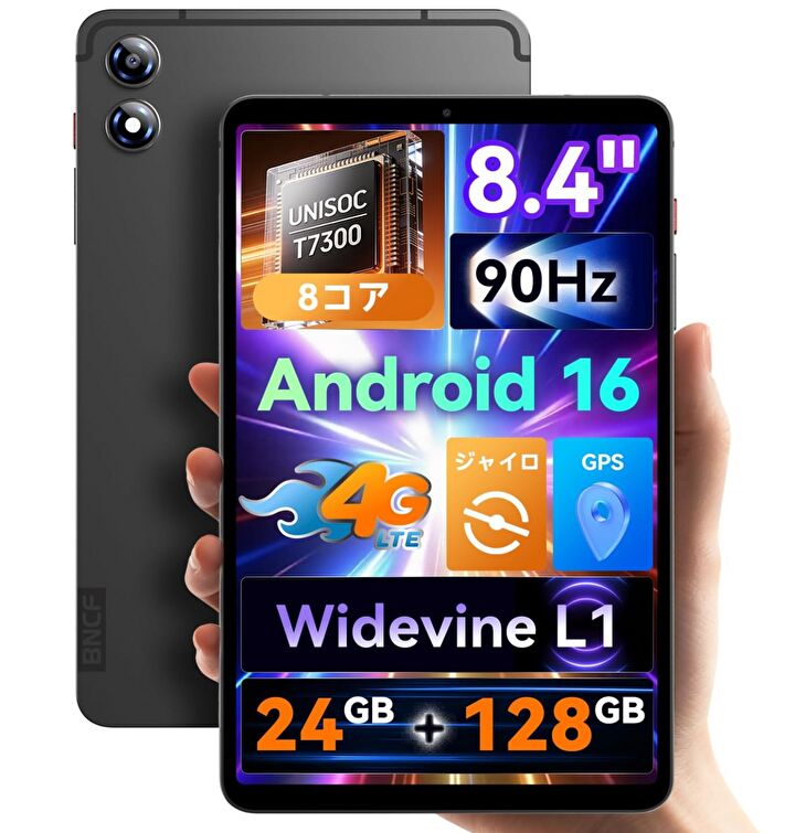 「BNCF」ブランドより、AnTuTu ベンチスコアが約62万となる UNISOC T7300を搭載する 8.4インチタブレット「BNCF BPad T1」が販売されています。8.4インチ液晶はFHD、物理メモリは8GB、LTEに対応、Widevine L1をサポート、2スピーカーを搭載と、バランスのよいスペックと機能にして、Amazon クーポン価格 18,999円での販売です。