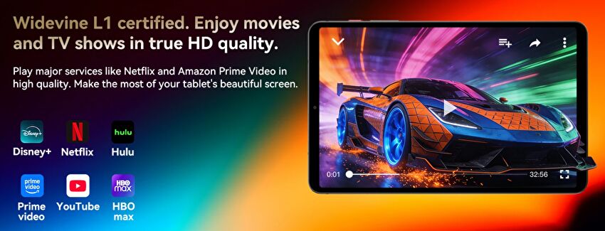 ▼以下の画像のとおり、Netflixも含めて(ロゴが表示されている場合、確実に対応)、動画配信サイトの動画を高画質再生可能な「Widevine L1」に対応しています。8.4インチ液晶の解像度はFHDですので、これとあわせて 例えば Netflixの場合にはFHDでの動画再生が可能です。