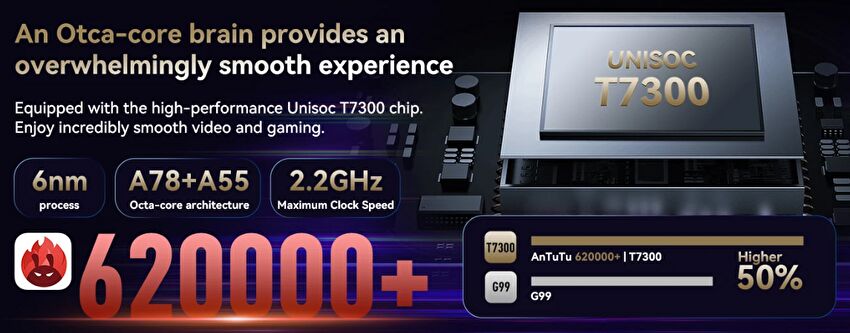 | CPU | UNISOC T7300、6nm プロセス、8コア(A78 2.2GHz x 2 +A55 2.0GHz x 6) |