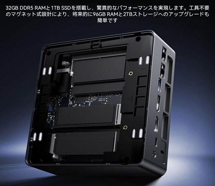 基本スペックは下位ですが、本製品では メモリが2スロット(EVO-X1はオンボード)、USB4を2ポート搭載するメリットがあります。なお、「MINISFORUM」「GMKtec」の製品と異なり、OCulink ポート(電源・ドッキングステーション・グラボを用意することにより、USB4経由よりも高速な転送速度でのグラボを接続可能)を未装備です。