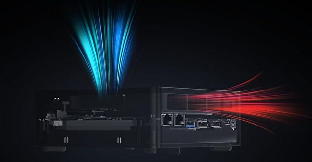 ▼このクラスのミニPCでは、CPUファンのほか、SSDとメモリの冷却用にシステムファンを備えている製品も多いなか、本製品はファン 1つです。ただし、140 × 139 × 55 mmと ミニPCとしては大柄なサイズであり、内部の空間に余裕があるように思います。