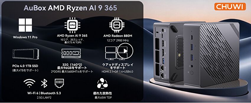 CHUWIより、CPUにAMD Ryzen AI 9 365を搭載するハイエンドミニPC「CHUWI AuBox Ai365」が発売となりました。同クラスのミニPCとしては、「MINISFORUM」「GMKtec」「GEEKOM」などから、Ryzen AI 9 HX 370を搭載する製品が販売されていますが、本製品は下位のRyzen AI 9 365の搭載により、メモリ 32GB / SSD 1TB モデルが 118,800円と、価格を抑えての販売です。