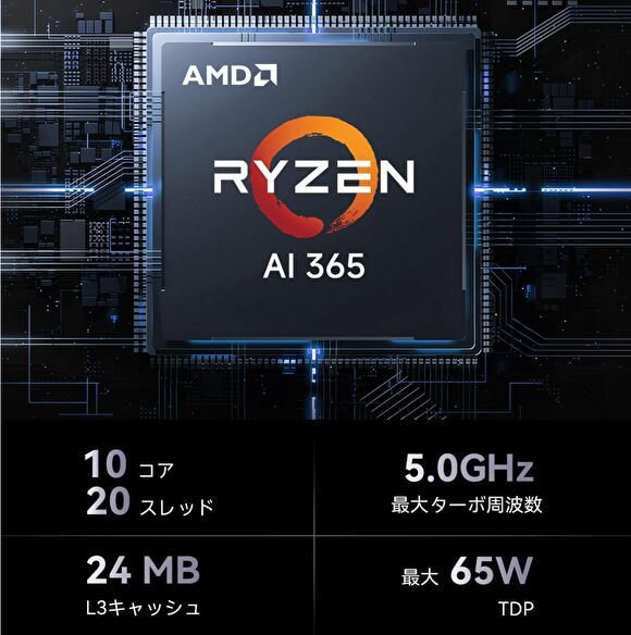 | CPU | Ryzen AI 9 365、Zen5 アーキテクチャ、10コア 20スレッド |