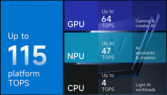▼AI性能は、NPU単体で47 TOPS、GPUとCPUと合わせて 115 TOPSの実力です。