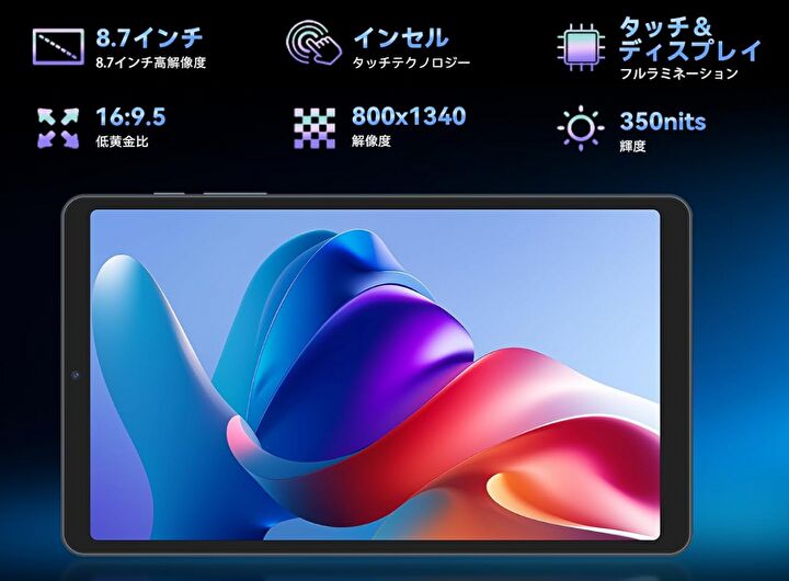 | ディスプレイ | 8.7インチ、解像度 1340 x 800、90Hz リフレッシュレート、輝度 350 nits |